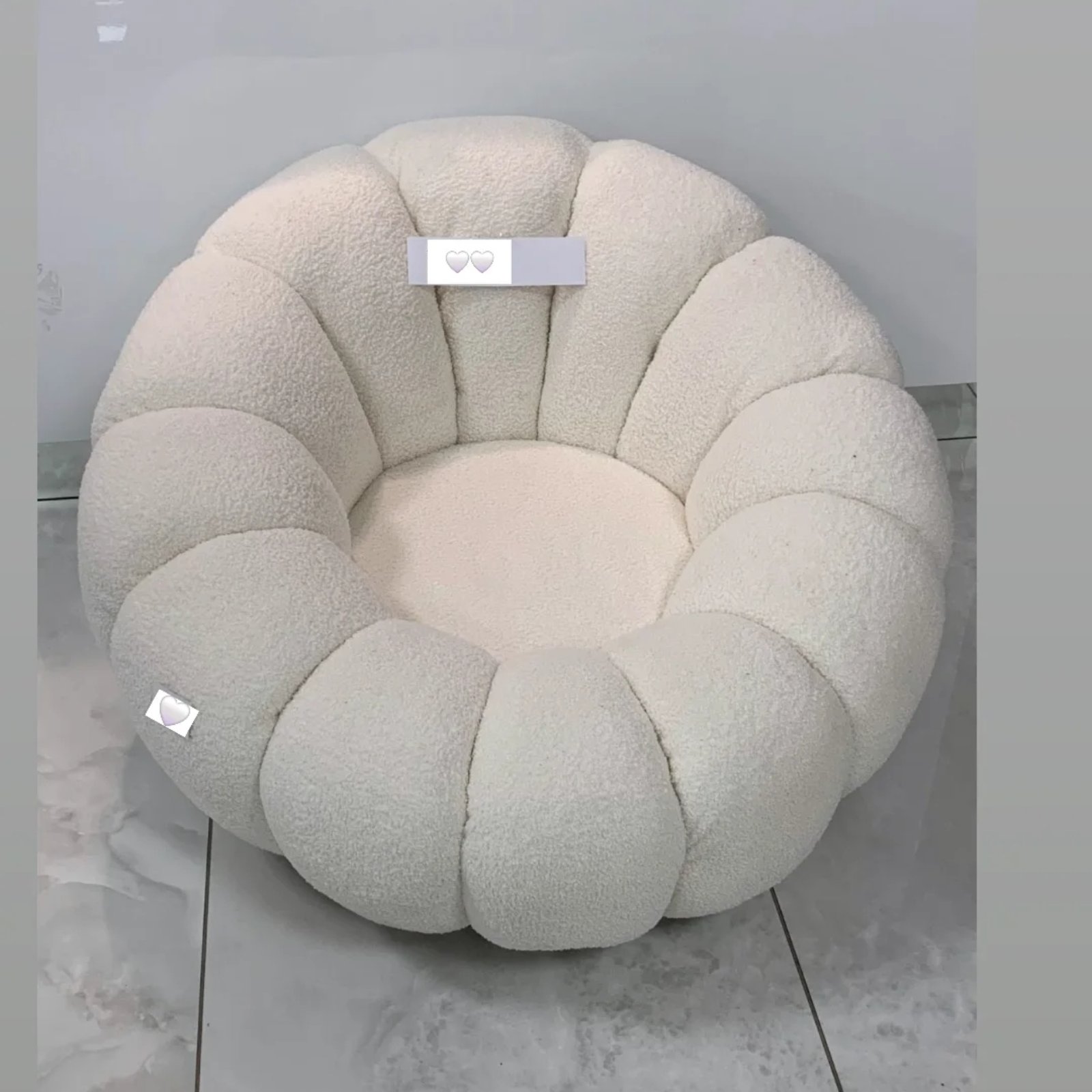 Okrugla Fotelja u Teddy belom stofu atraktivna i moderna.